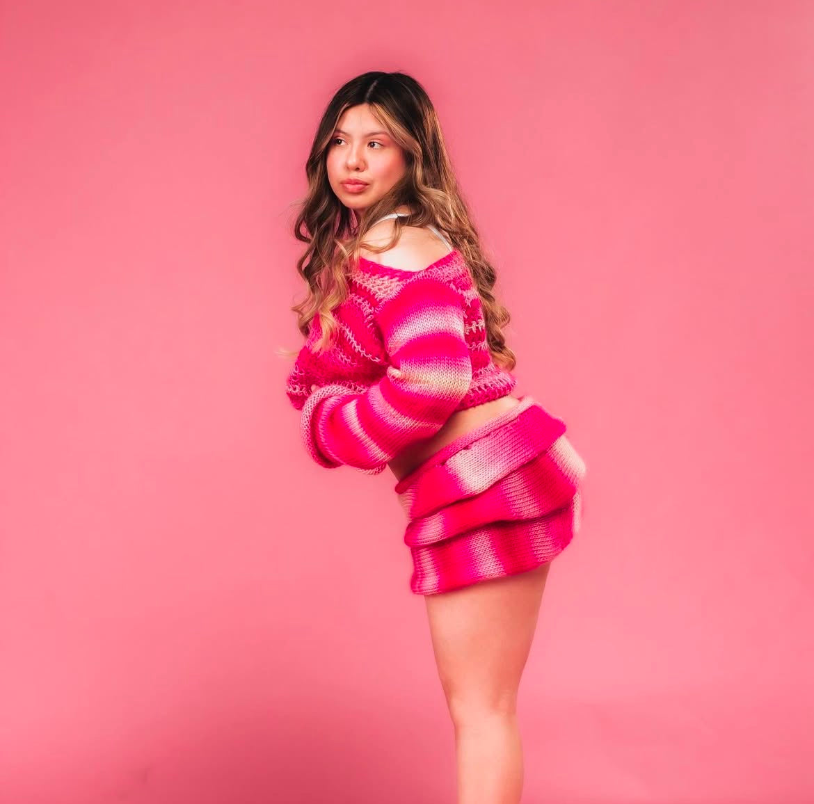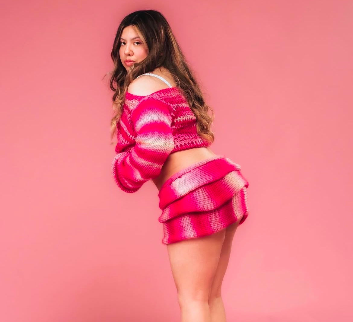 polyester knit and crochet two piece set, sweater has standard 21” sleeves. skirt is 12”.