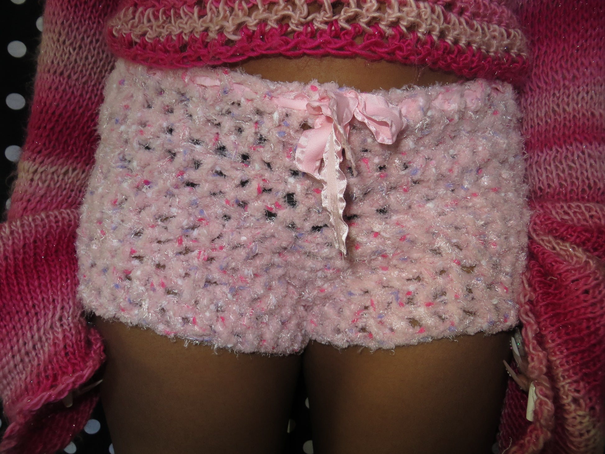 Handmade crochet baby pink peek-a-boo micro shorts. Only available as a 1/1. For custom orders please reach out to us @jdnathebrand on Instagram with references.